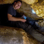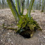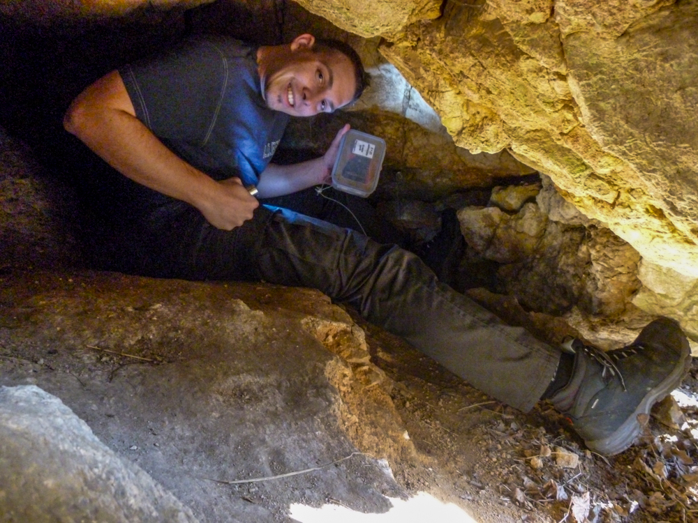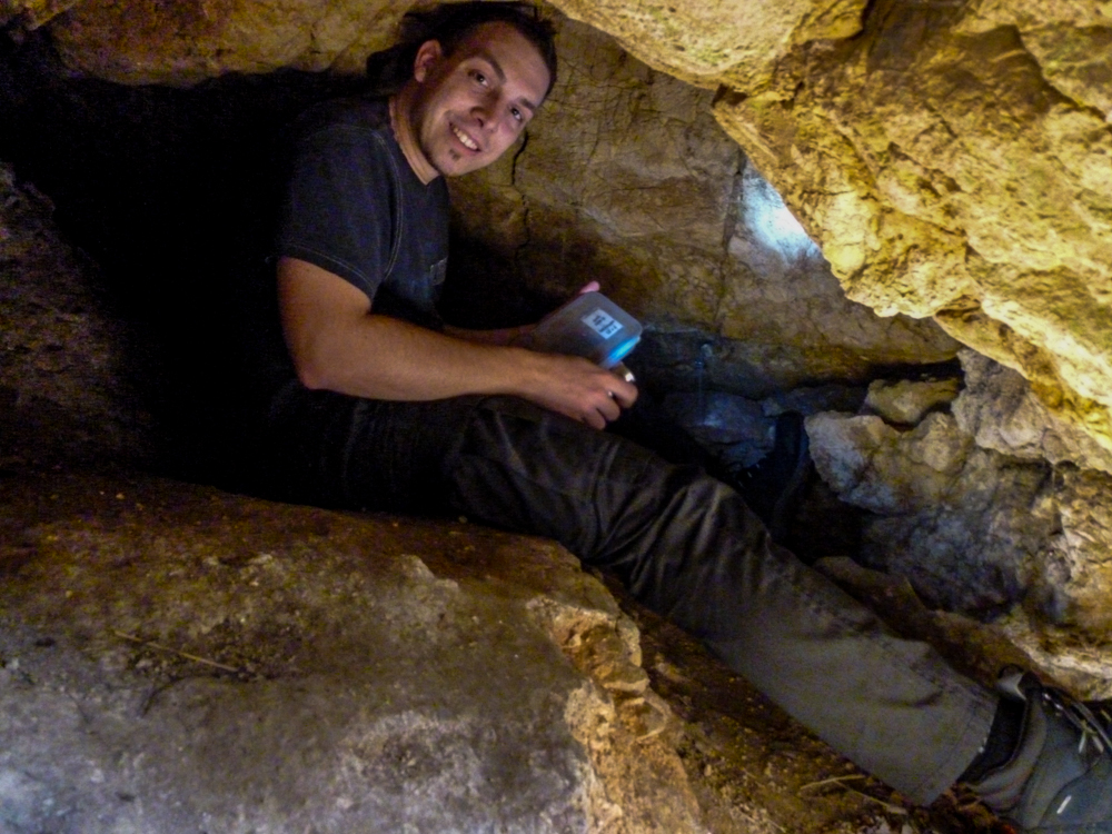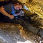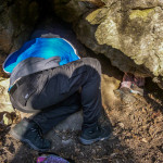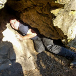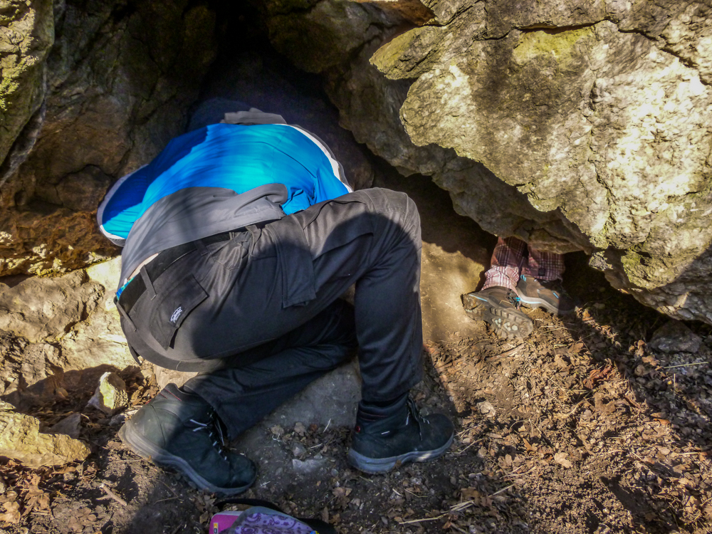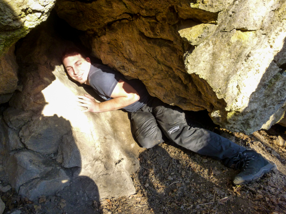Cestou za roztroušenými skupinkami jsme si pobrali chybějící tradičky, setkali se zpátky s markem-26, xteenou a Lukášem a hurá za Caravelem a špáčem. Pokochali se výhledem na hrad, no spíše vykukující věž (obr.10) a zavítali i do Kanady. Co se tady dělo, to nevymyslíš 😆 škatule byla zašitá ve skalní dutině, kam se nejdříve dostala Bublina a doslova jí vykukovaly pouze nohy 😆 (obr.11). V Markovi se probudilo srdce dobrodruha a chtěl se tam dostat také. Tam to celkem šlo, zabydlel se tam 😆 (obr.12 a 13). Když něco řekl, asi poprvé jsem slyšel skálu mluvit, nikde nikdo, jen ze skály se nesoucí hlasy 😆 Bohužel, ven už to tak lehce nešlo (obr.14) 😆 , když už jsme to tu chtěli přejmenovat na „markova poslední štěrbina“, povedlo se a Marek byl zase venku 😀 Pokračujeme dál.