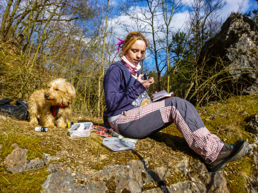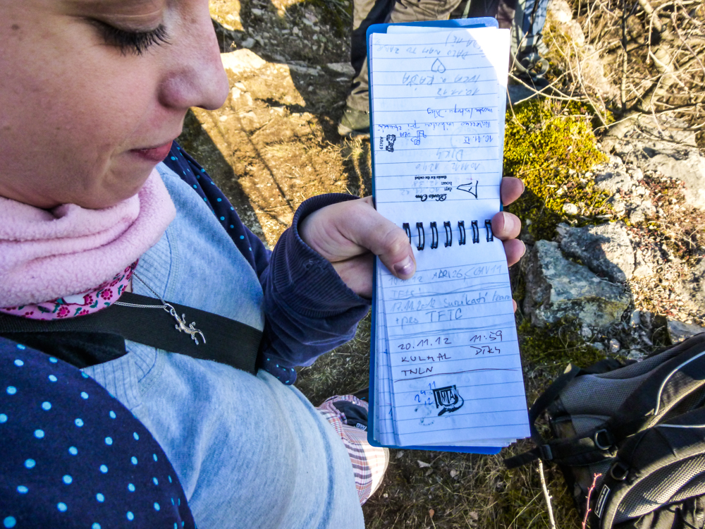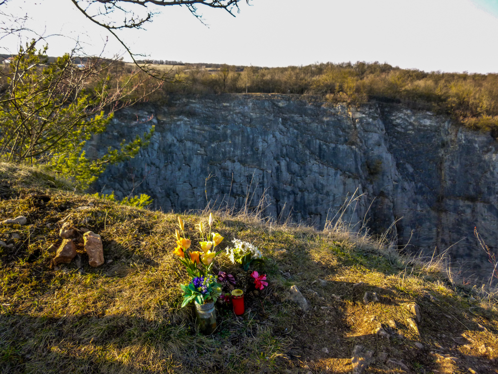 Z hřebene lomů, jsme měli krásné výhledy na důlní techniku (obr.15) a ty masy kamene pod námi a před námi (obr. 16). V jednom logbooku pak našla svůj zápis i Bublina ze Surikatího týmu (obr.17) a xteena, která zde byla už několikrát, ale vždy se ráda vrací (z dnešního výletu měla jen dva bodíky 😎 ). Ty strmá skaliska umí být i pěkně zrádná a tak jsme tu potkali i několik pomníčků (obr.18).