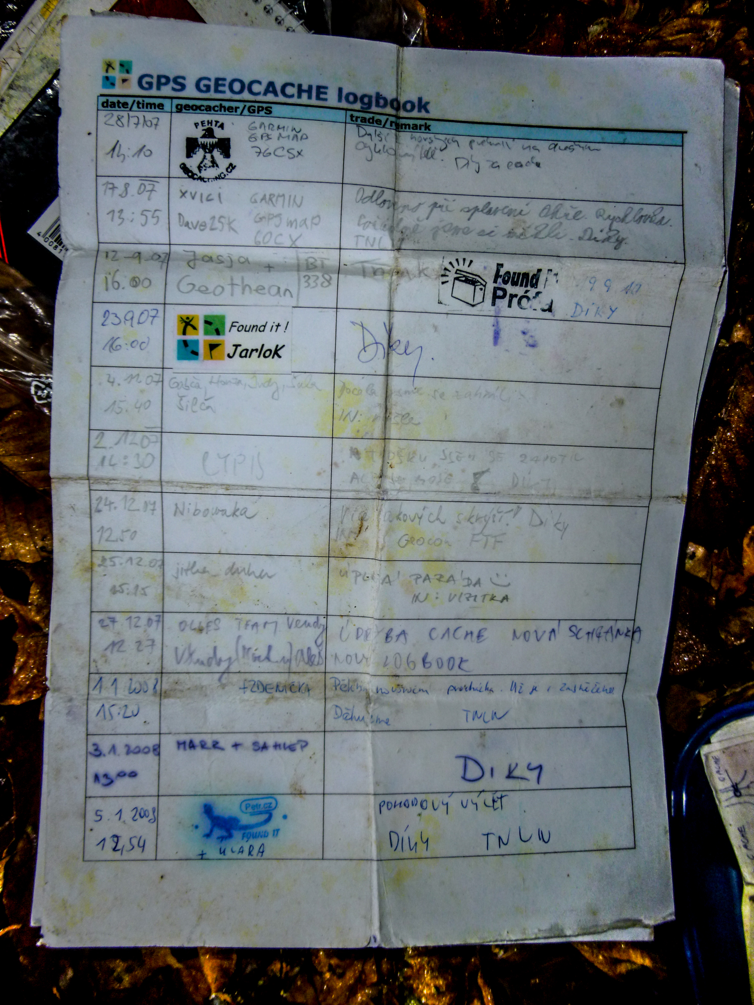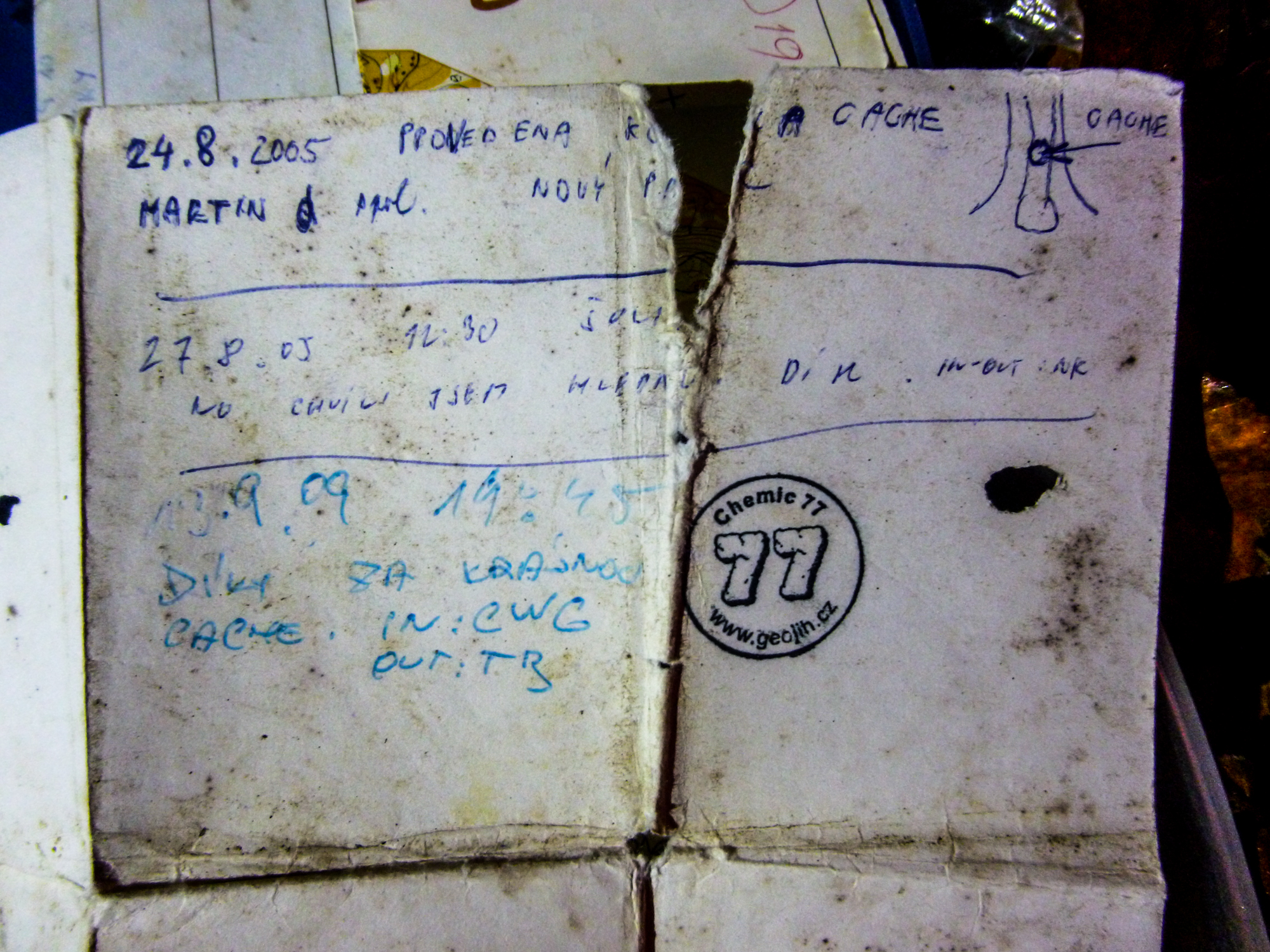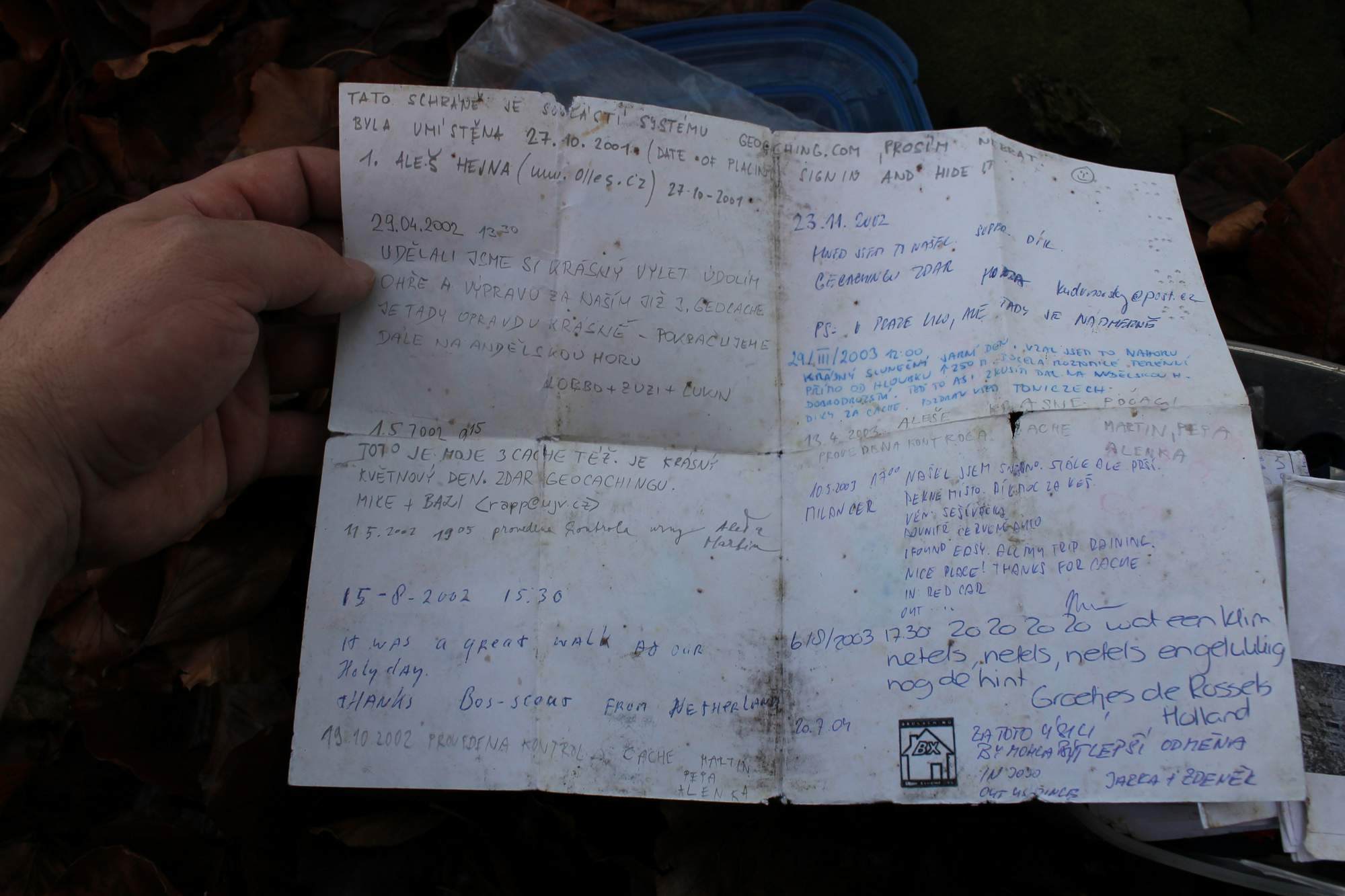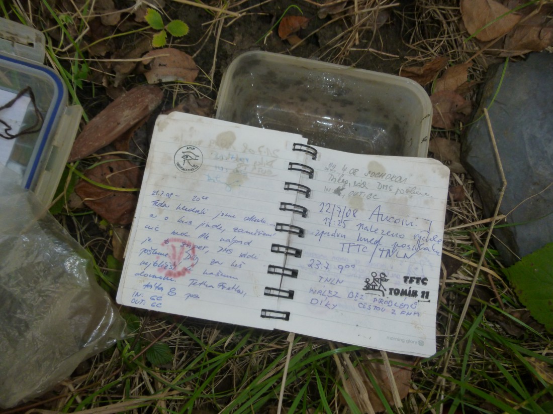 A galerie z 29.11.2014. Na první fotografii můžete porovnat, jak se na logbooku podepisuje zub času. Na páté fotografii ukázka mapy, na kterou se logovalo. Od roku 2006 následoval klasický A4 logbook té doby.