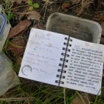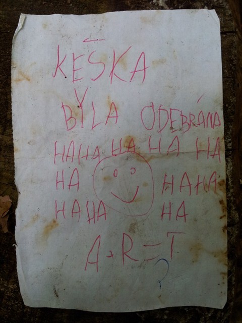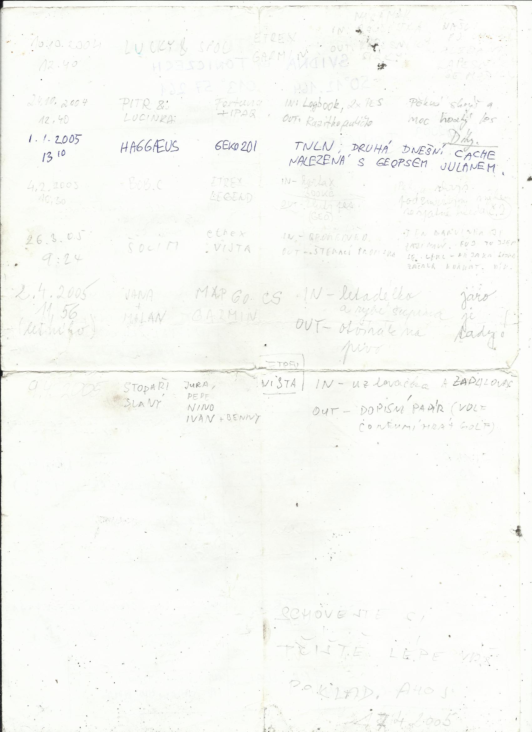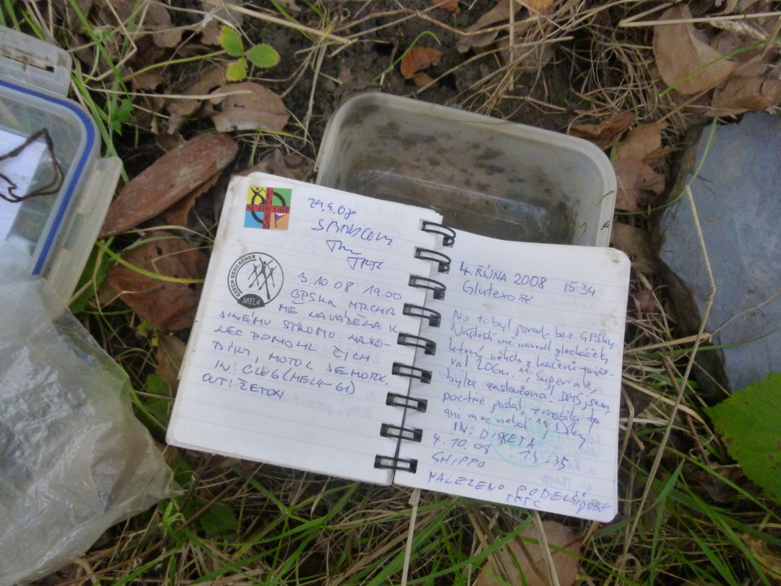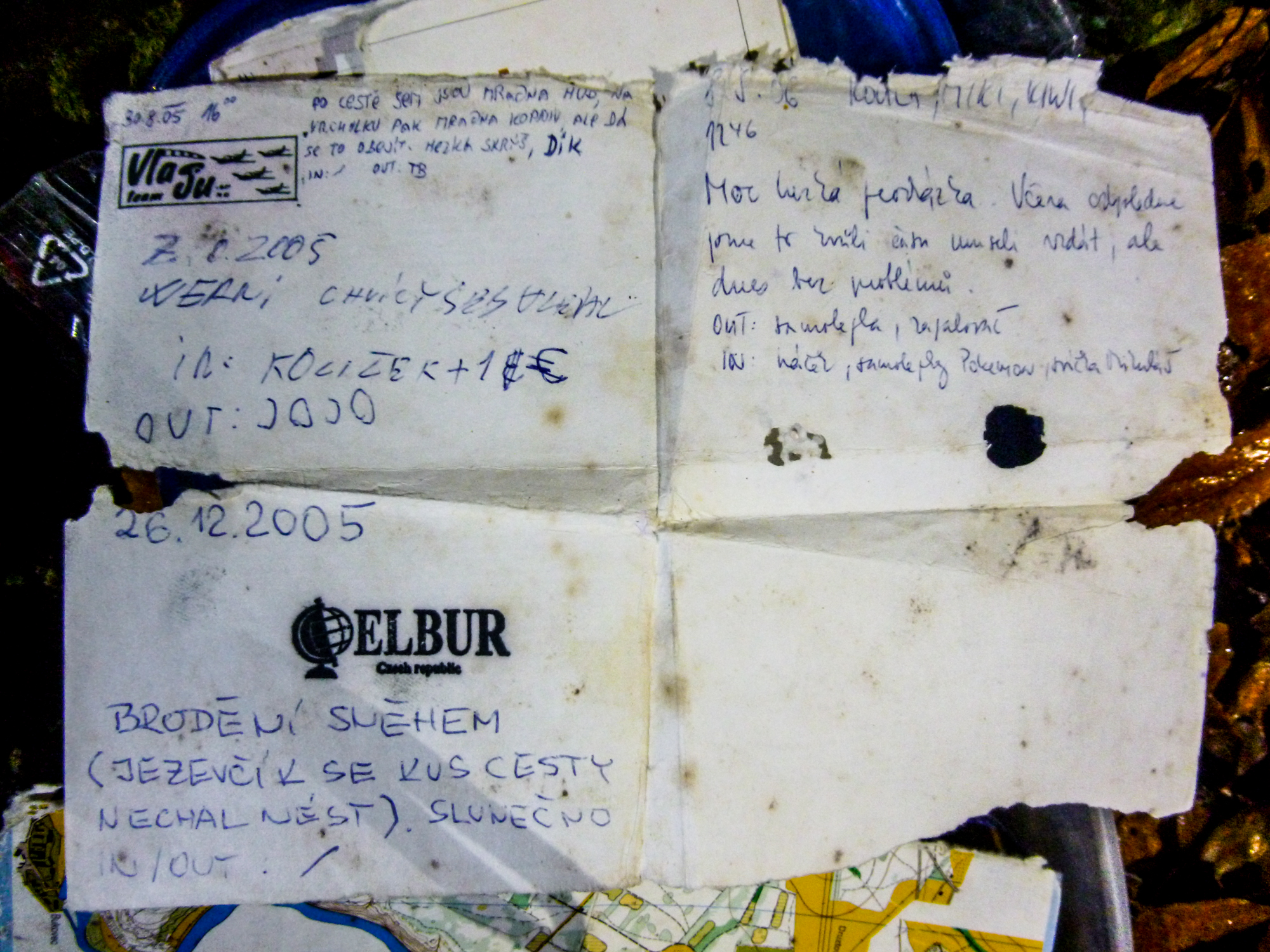 A galerie z 29.11.2014. Na první fotografii můžete porovnat, jak se na logbooku podepisuje zub času. Na páté fotografii ukázka mapy, na kterou se logovalo. Od roku 2006 následoval klasický A4 logbook té doby.