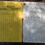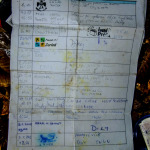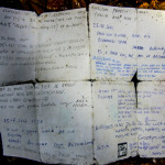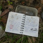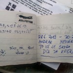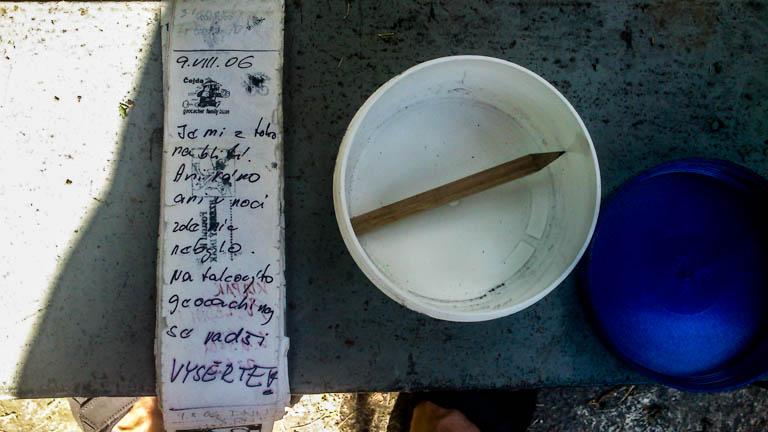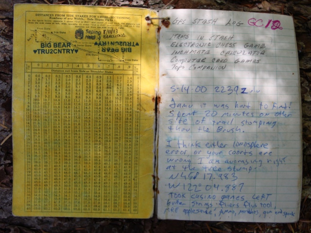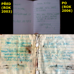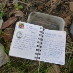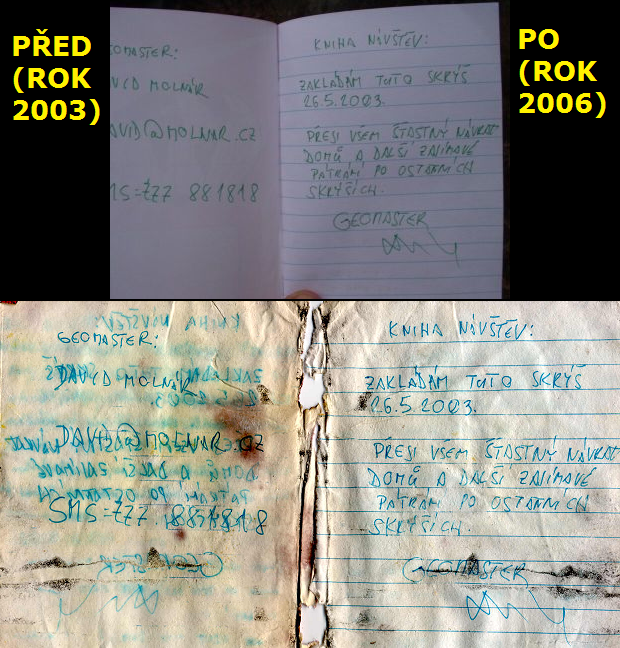 Následuje další zajímavá galerie. Na první fotografii je relikvie zahraničního logbooku ze 14.5. roku 2000. GC12. Na druhé fotografii je relikvie „mudlokarty“ z roku 2002 od Milancera. Owner si dal opravdu záležet na detailním popisu. Na třetí fotografii je k vidění taková malá kuriozita. Fotku logbooku GCG6QJ z roku 2003, kdy voněl čistotou a pod ním nezávisle pořizená fotografie stejného logbooku v roce 2006. Zub času se podepsal. Nakonec ještě jeden starý a vtipný log zhrzeného kačera, kterému se nepovedlo FTF 😀 (2006).