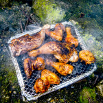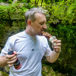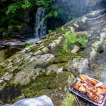 Z toho všeho už nám solidně vyhládlo, takže přišel na řadu zlatý hřeb dne, grilovačka! Hned vedle předchozí kešky se nacházel starý mlýn, u kterého byla hráz a náhon tu vytvářel vodopád…no prostě ideální místo! A kde takový gril rozohnit? No přeci přímo uprostřed řeky 😀 Mimozakon bral jednorázový gril, který se zdal z počátku ideální, ale když vyhořel papír a gril byl stále studený, zjistili jsme, že je spíše nulorázový 🙄 ale nestahujme kalhoty, brod je odtud daleko, udělali jsme si z jednorázovky plnohodnotný gril, naházeli na něj hromadu chroští, udělali regulerní ohníček, na žhavý základ jednorázové uhlíky a mohlo se grilovat! 😎 Jééje, to to vonělo! A to prostředí, no prostě ideál!