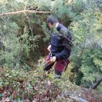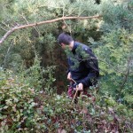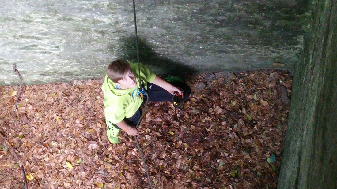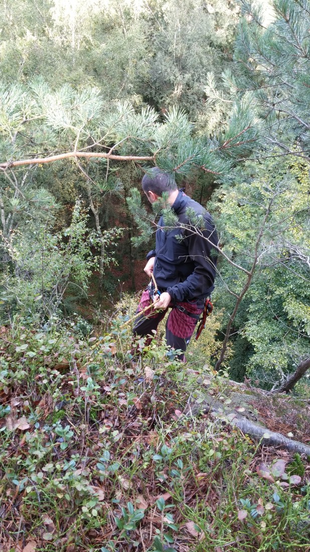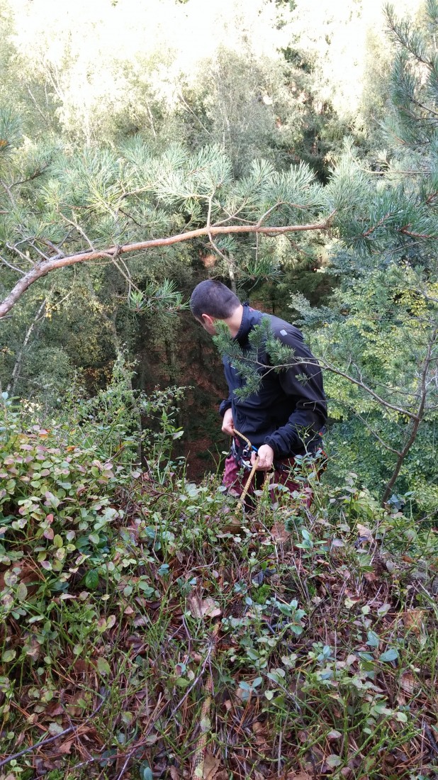 Vzali jsme všechny věci a vyrazili směr druhá stage. Ta nás velice překvapila a znovu jsme volali Hloustovi a pořád nic. Tak jsme to zkusili sami, dali na konec lana uzly a Pajamora šel znovu do toho. Zatim co lezl, Chorchoj hledal houby a v okolí jich našel celkem dost. Poté jsem seběhl pro indicii, kterou mi Paja nadiktoval a běžel jsem zpět zase sbalit lano a vyrazit na poslední stage a cestou obdivovat okolní přírodu a zajímavé kopce a skály. Po příchodu jsem se cpal do pujčeného sedáku od Dekamerona a po chvíli jsem lezl bezpečně dolů, ne jako náš malý spiderman (nic ve zlým). Po prohledání okolí jsem našel stage a mohl jsem lézt nahoru ukázat i ostatním, vyfotit a zase stage uklidit. Poté jsme vyrazili přes kopec na lahůdku a cestou od lahůdky jsme našli T5-geo-houbařské místo se spoustou hub. Chvíli jsem stál a ukazoval Chorchojovi kde má sbírat a když jsem viděl kolik jich je, tak jsem taky sbíral a předával k očištění a vložení do tašky.