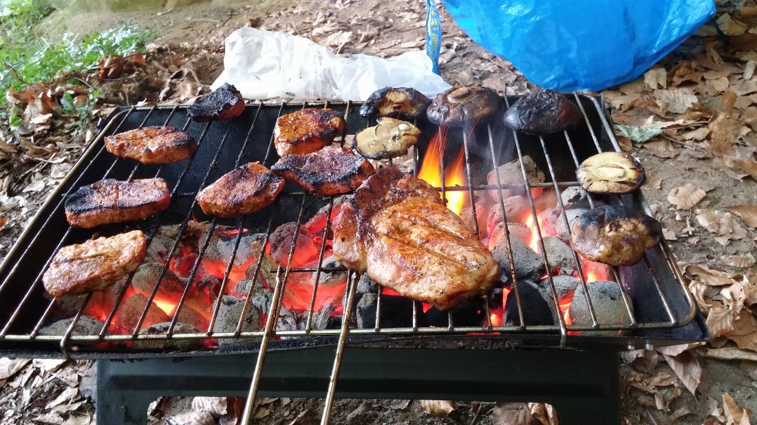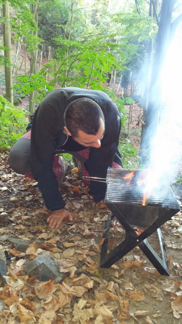 Po příchodu na místo finálky jsme měli dost míst, kde by mohla být, a už tak 30 metrů od geomísta jsme odhodili lana, batohy,houby,gril,brikety, no prostě všechno kromě mobilů, a kterými jsme hledali místo, kde ta keš je. Po důkladném prohledávání (cca 40 minut), jsme se rozhodli projít pár logu, znova prohledávali okolí, ale už trochu jistěji a pořád nic. Už mě to nebavilo a byl jsem již smířený s tím že tam není. Pak přišla poslední šance zavolat Obludce, které tímto děkujeme za pomoc s hledáním. Sice nápověda nebyla dost jasná, protože nás nechtěla připravit o překvapení a povedlo se. Po chvíli jsme byli u finálky a byly jsme z toho opravdu nadšení. Pak jsme se rozhodli rozdělat gril, na oslavu odlovení keše. Dali jsme si maso, topinky a čerstvě nasbírané klobouky hub a po hodince jsme mohli hasit rozžhavené uhlíky poslední vodou co jsme měli.